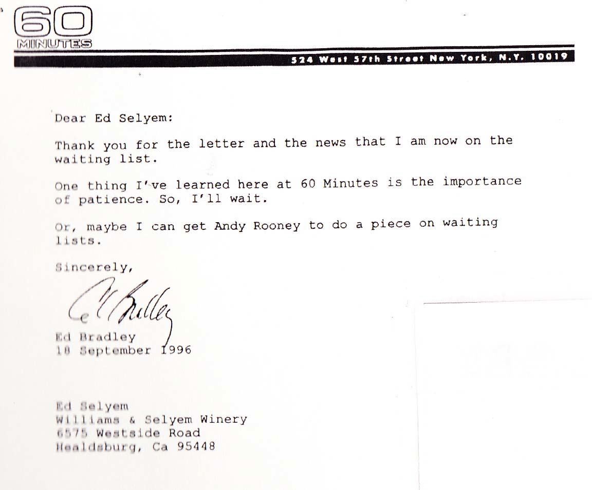checks for as much as $50,000 in orders. Ed Bradley, a correspondent on CBS’s “60 Minutes,” was a wine
