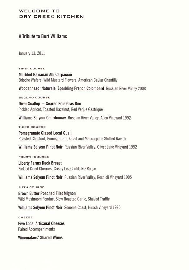The menu and the wines for the Tribute to Burt Williams are shown below: