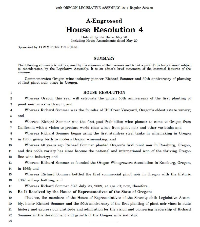 Assembly, commemorates both Oregon wine industry pioneer Richard Sommer and the 50th anniversary of the