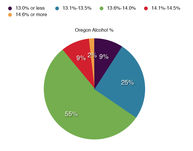 between 14.1 and 14.5 alcohol. In comparison, the Oregon Pinot Noirs ranged in alcohol percentage from 12.4