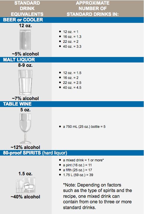 pure alcohol) which is equivalent to 12 ounces of beer (about 5% alcohol), 5 ounces of table wine (about 12%