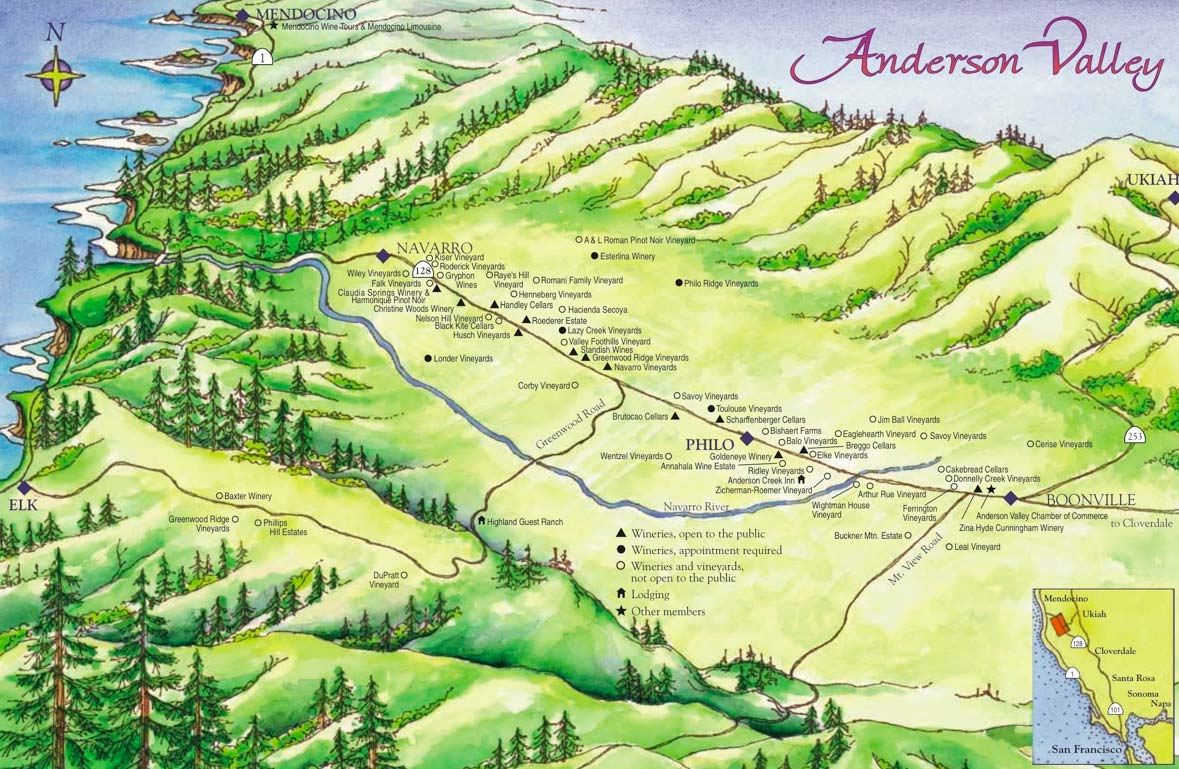 eventually reaching the town of Mendocino and the Pacific Ocean. The latest map of the Anderson Valley