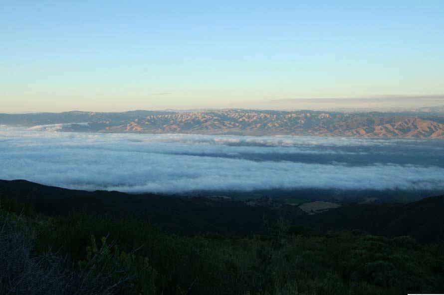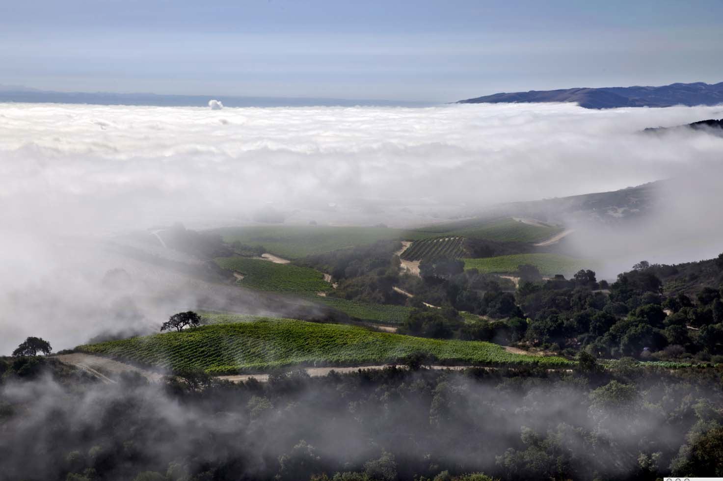 Bay rolls in and blankets the entire Salinas Valley and Santa Lucia Highlands. The fog stays until late morning