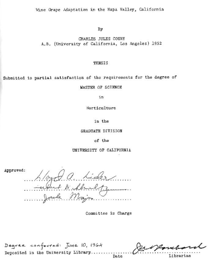Coury’s master’s thesis was titled, “Wine Grape Adaptation in the Napa Valley, California.” Coury claimed his