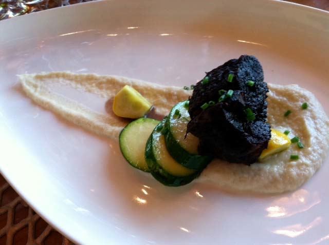 Liberty Farms duck rillette over crispy polenta squares with cherry-habanero glaze