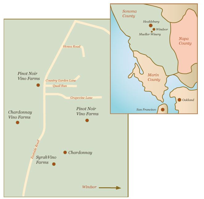Mueller’s Pinot Noir vineyard sources are Vino Farms located east of Eastside Road (see map below). Vino