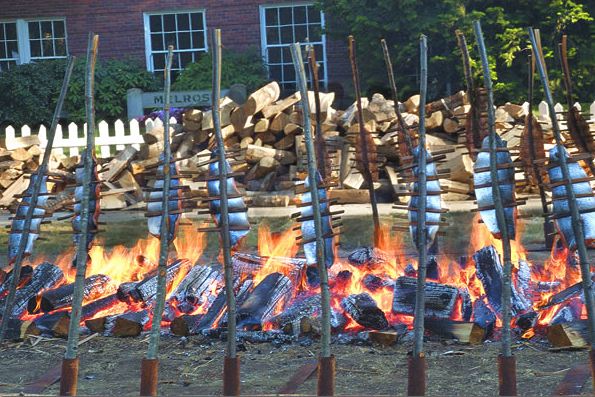 campus, wild Chinook salmon is cooked native northwest style on wood stakes over a wood-fired pit.