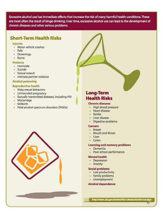 disease, drinking too much over a short period, violence, alcoholic poisoning, and motor vehicle crashes.