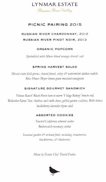 seated for a Picnic Pairing 2015 lunch at Lynmar Estate (menu is reproduced below). Lynmar Estate has a full