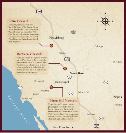 rootstock. Benovia Winery now has 71 acres of Pinot Noir, Chardonnay and Zinfandel vines in three distinctive
