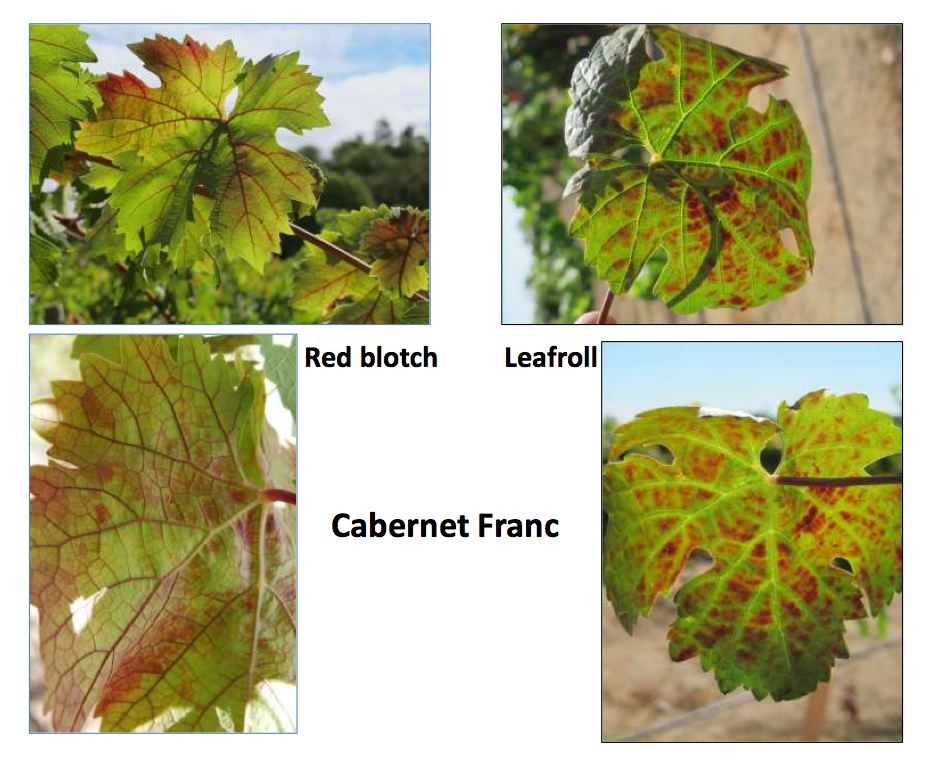 Cabernet Sauvignon and Zinfandel grapevines that exhibited foliar symptoms of red blotches and red veins