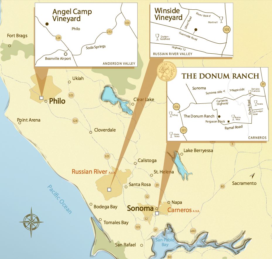 Donum Ranch and also in Carneros), the 16-acre Winside Vineyard located in the Russian River Valley, and