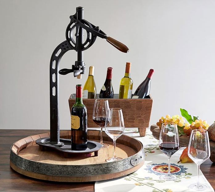Very Cool Wine Opener The vintner’s standing wine opener available at www.potterybarn.com is an extravagant ($299) device for opening wine but its industrial gear design is very appealing.