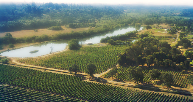 The aerial photo of the B Vineyards & Habitat shows Hartford Family Arrendell Vineyard in the foreground,