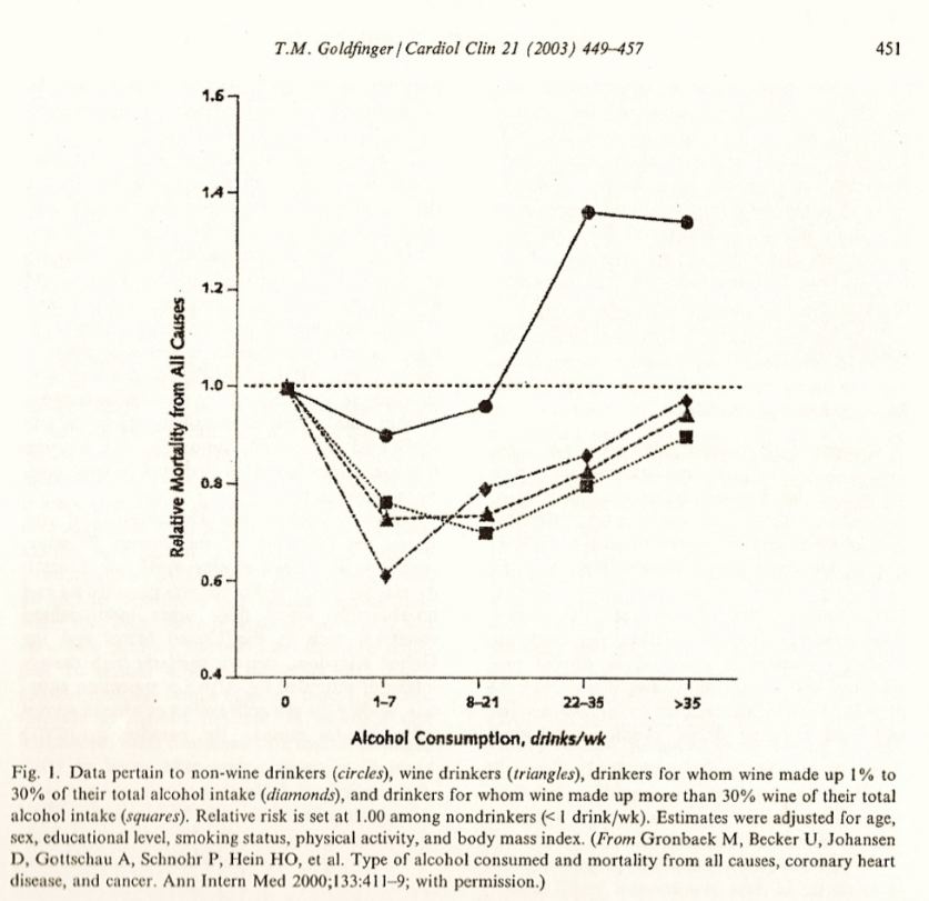 grams of alcohol per day) consumers of wine and specifically red wine, showed a 38% reduction of all-cause