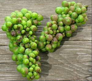 since the skins are included in the wine production. The photo below shows two sunburned Pinot Noir clusters