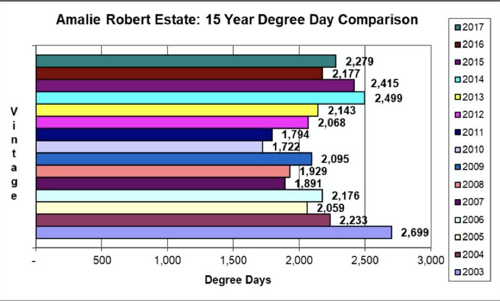 The chart shows that 2014 and 2015 vintages were the warmest since 2003. 2016 was more moderate yet still