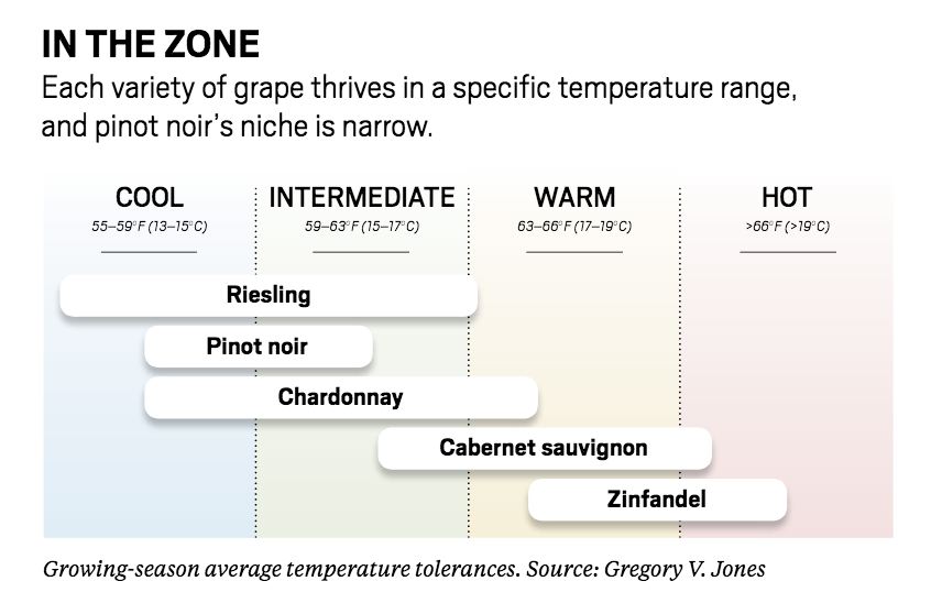 Pinot Noir is particularly heat sensitive and thrives only within a specific and narrow temperature range. Elin