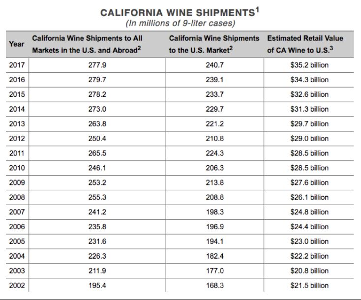 In 2017, California wineries shipped 241 million cases to the U.S., a 60% share of the U.S. wine market. Total