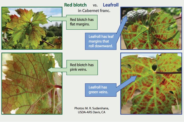 blotch turn partly or fully red while leafroll-infected vines exhibit green veins. A comparison of red blotch and