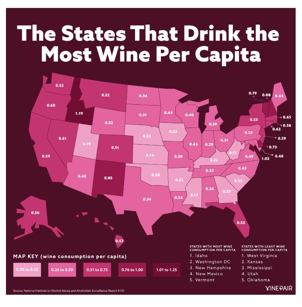 States That Drink the Most Wine States with the most wine consumption per capita include Idaho,