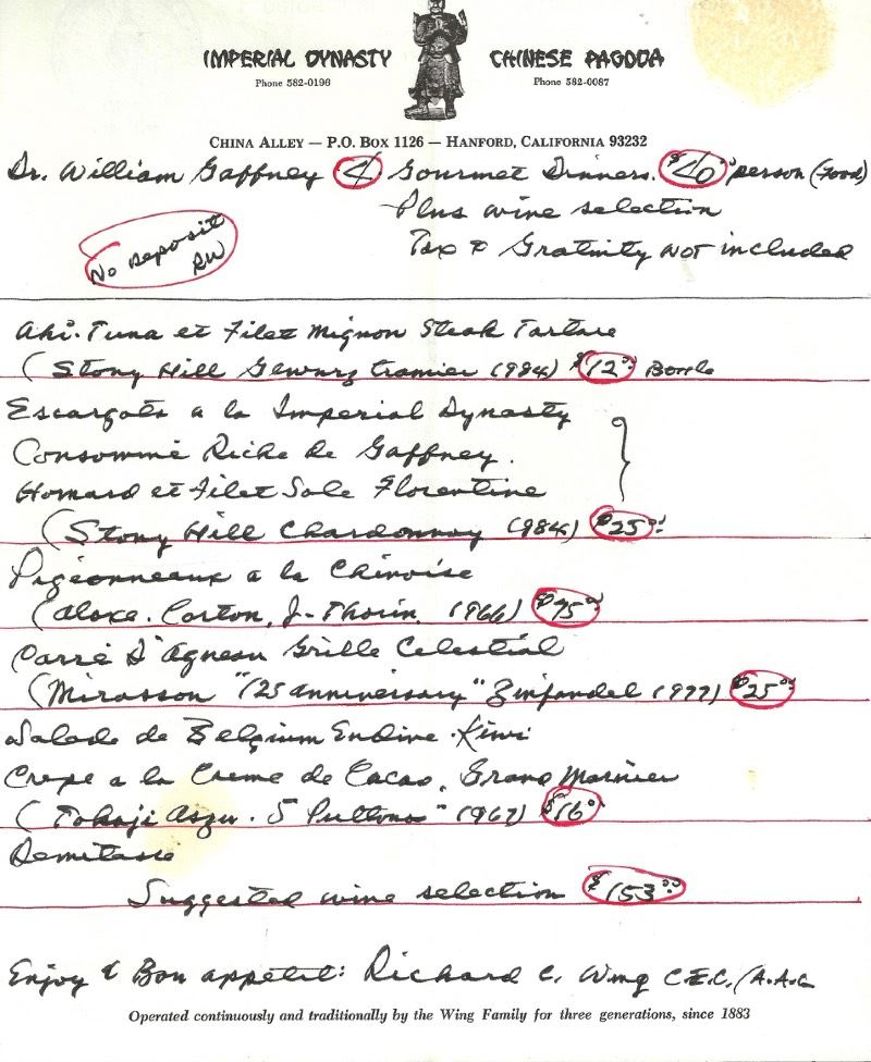 Hill wines in his prix fixe meals. Here is an example from April 12, 1987: