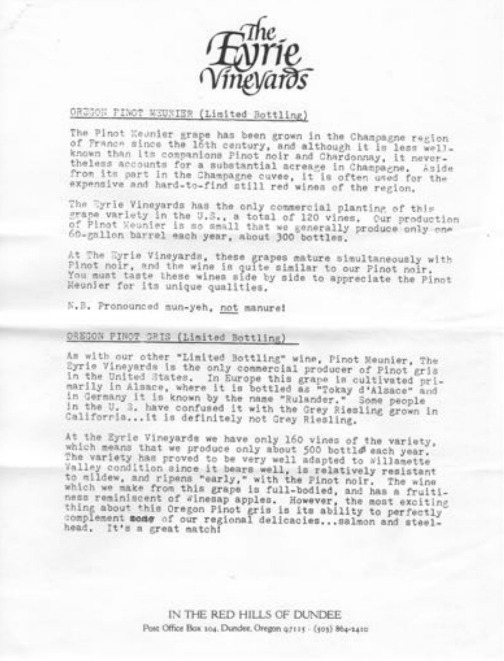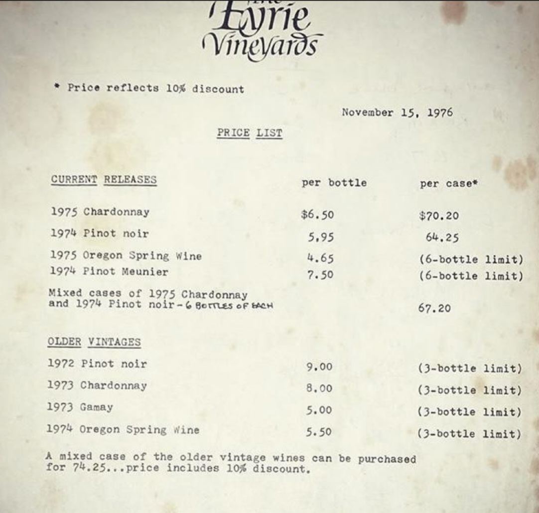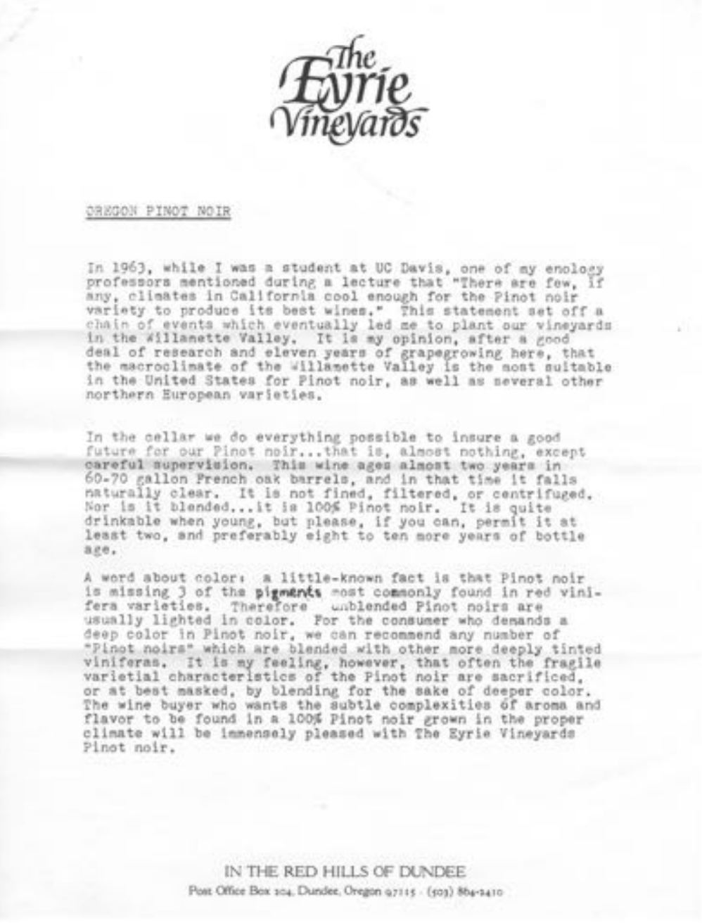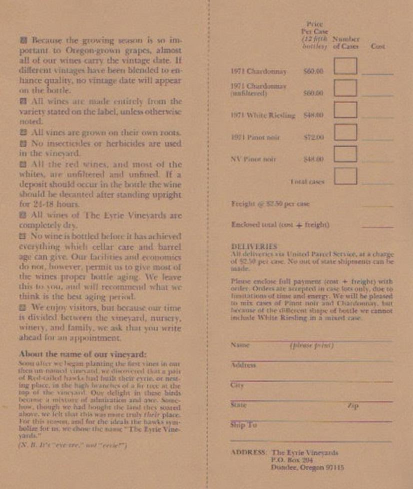 Jason Lett sent me a 1976 direct sales mailing from the Eyrie Vineyards. I believe the reader with an interest in