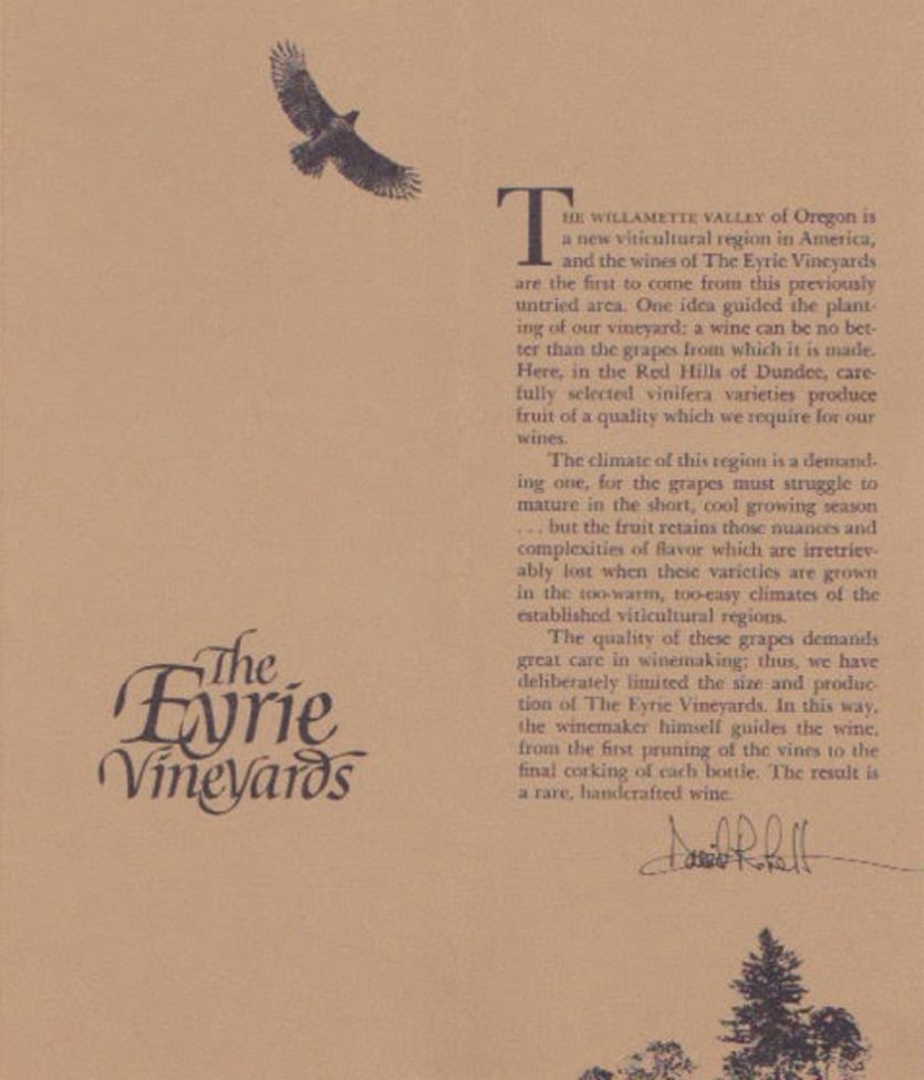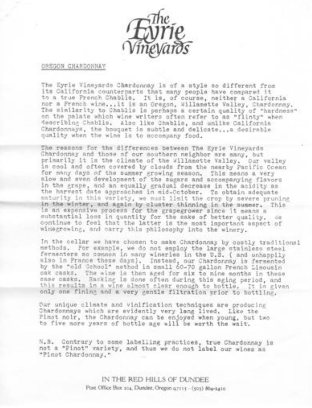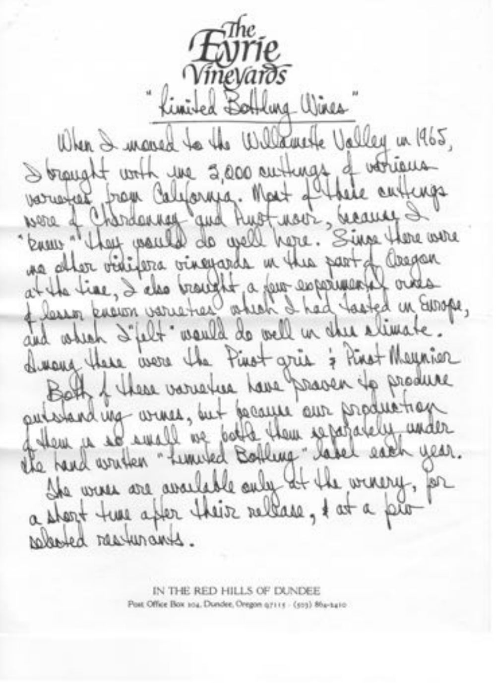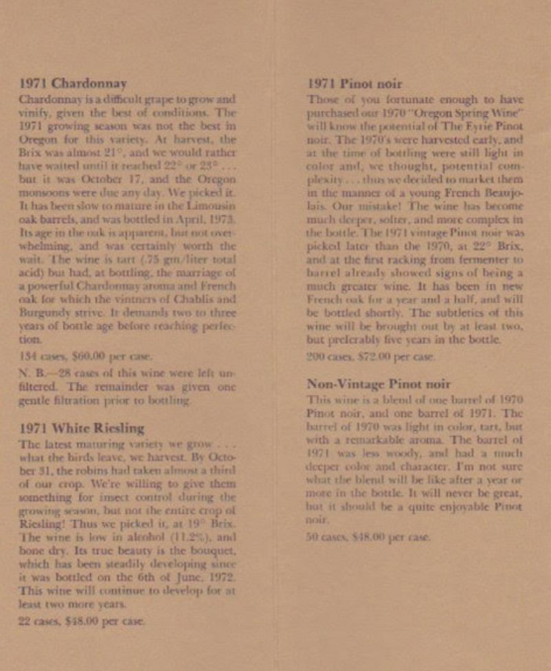 Jason Lett sent me a 1976 direct sales mailing from the Eyrie Vineyards. I believe the reader with an interest in