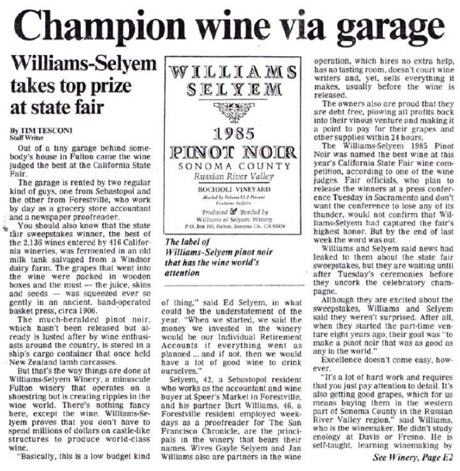 top prize won by Williams Selyem (copied below). Note the incorrect name of the winery in the article, for the