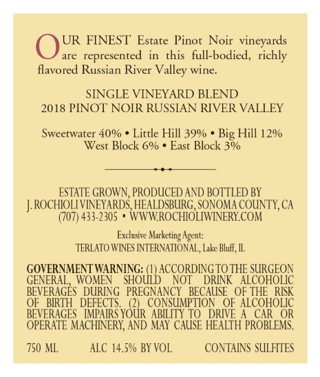 words “Single Vineyard Blend” to indicate that the Estate wines are sourced from single vineyards at Rochioli.