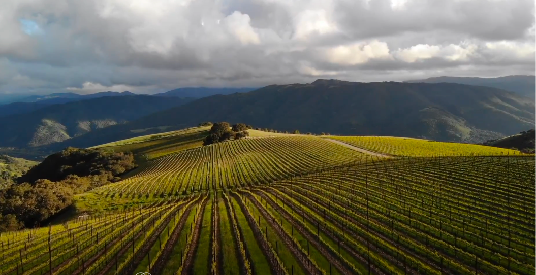 The vineyard is located just seven miles from the Pacific Ocean and overlooks Carmel Bay in the distance with