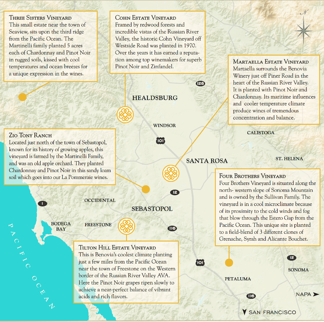 Today, Benovia produces 10,000 cases of Pinot Noir, Chardonnay, Zinfandel, Rosé, sparkling Blanc de Blancs