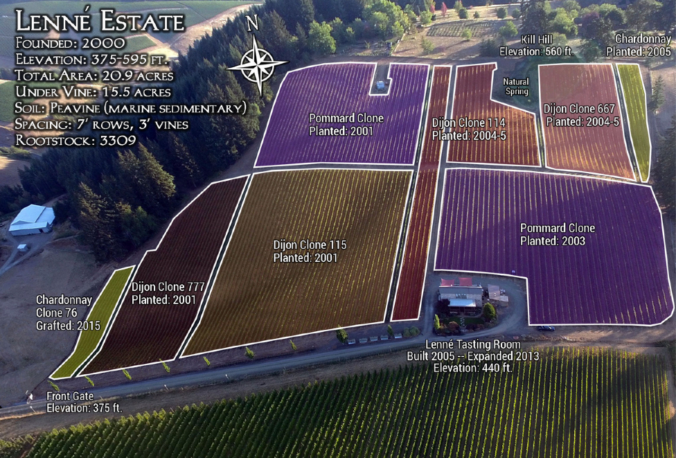 The Lenné Estate Vineyard was first planted in 2001 and has 15.5 acres under vine. The vineyard has ideal