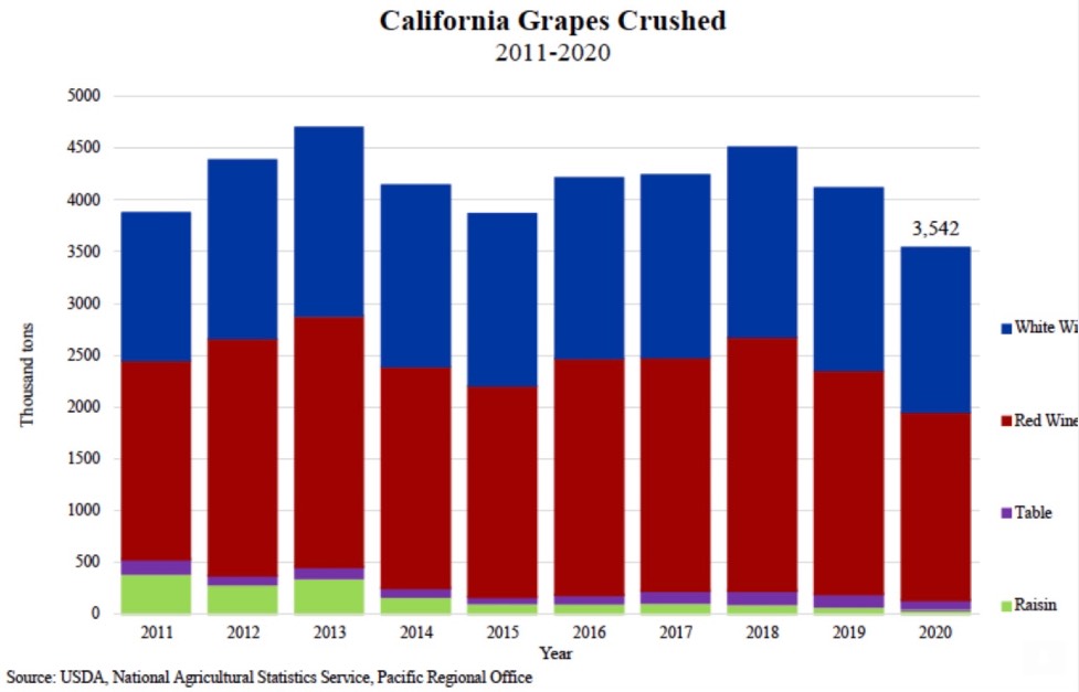 The chart below shows that the tons of grapes crushed in California in 2018 exceeded all of the previous ten