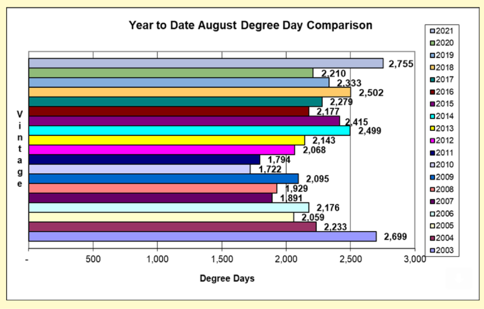 The Year to Date August Degree Day Comparison shows that 2021 has been the warmest growing season