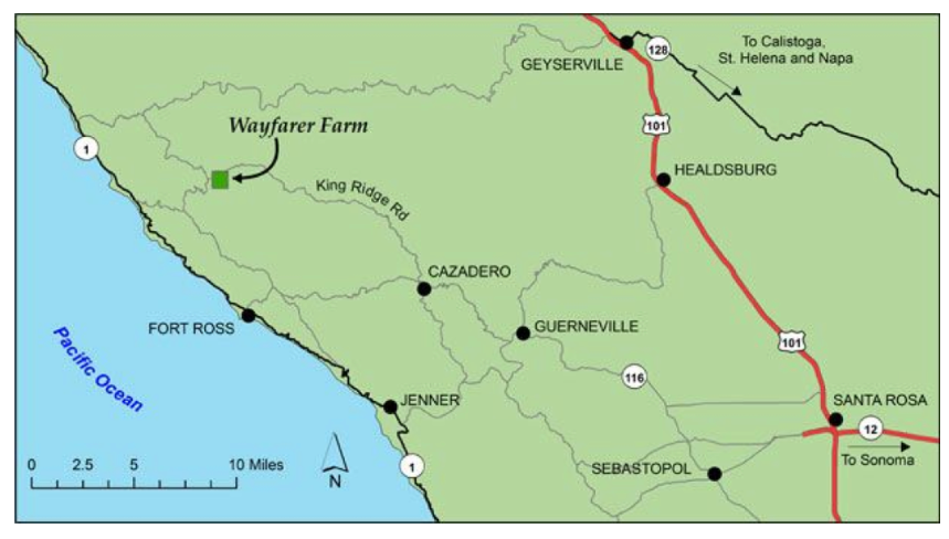 Wayfarer Vineyard is located in the Fort Ross-Seaview AVA less than 5 miles from the Pacific Ocean. At an