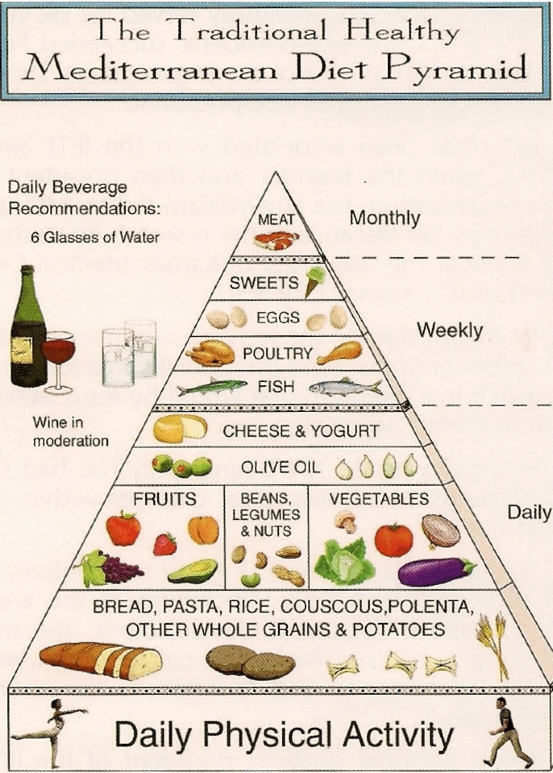 The traditional healthy Mediterranean Diet Pyramid does not distinguish between red and white wine, only that