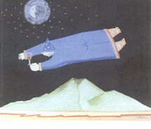 magician holding a glass of wine and flying over Mount Loma Prieta with an earthquake fault