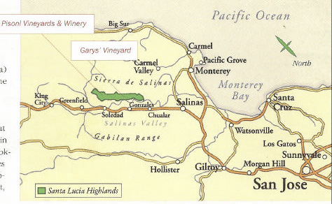 Pinot Noir from the Santa Lucia Highlands will vary from site to site. For example, the southern reach of the appellation is cooler and the north portion is warmer. In general, the wines are known for their opulent and lush dark fruit (plum, blackberry, blueberry, black cherry), spice, and earth-inspired flavors. They are remarkably distinctive and can be exemplary of the New World or Caliesque style of Pinot Noir. I think Paul Root said it best in 2004 in one of his e-mail missives (perhaps a bit exaggerated but very funny nonetheless: “The common theme which weaves its way through the SLH efforts is this: Nearly all we’ve tasted have been HUGELY extracted, powerfully fruity, muscular yet balanced and intensely flavored. Colors range from deep purple-blue to pitch black. They are near cloying in their viscosity and weight, and most importantly, they are a KICK to drink. An experienced, Burgundy-loving ‘Franco File’ would either be utterly awe-struck at the dimension of these wines or simply pass out in a foggy blur when pressed to compare them with their precious ‘terroir-infused, obscenely priced ‘Cote de Frou-Frou’ dust-covered jars in their ‘cauve’ back home.”