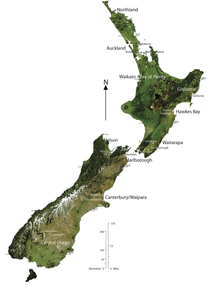 Winegrowers map on the next page. Wine grapes are grown throughout both Islands (growing latitudes are