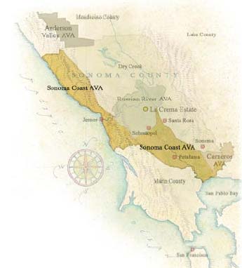 The Sonoma Coast AVA extends from the Sonoma County border with Napa Carneros to the East, to Marin