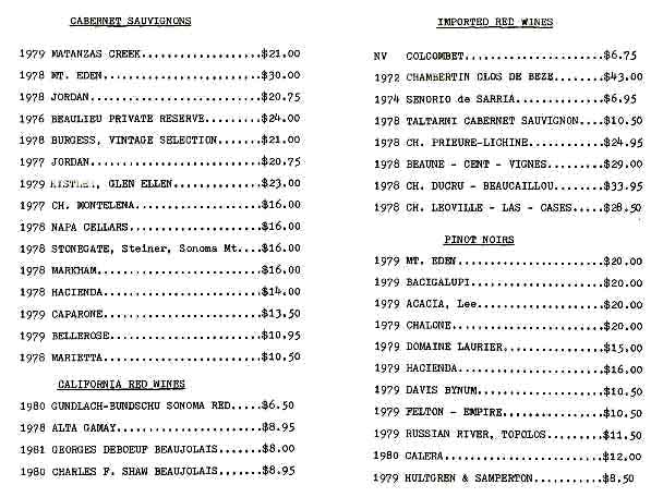 in price from $1.75 to a $3.25. Examples of wines sold by the glass included 1981 Kenwood Chenin Blanc