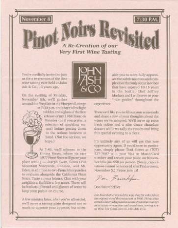 inaugural wine tasting at John Ash & Co. was 1977 Pinot Noirs. Billed as, “The finest collection of California