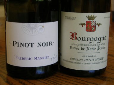 word “Bourgogne.” The labels of 2005 Frederic Magnien Pinot Noir and 2005 Domaine Denis Mortet