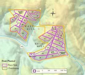 acres to Chardonnay. The vineyard faces south and is divided into two hills, named East and West, separated