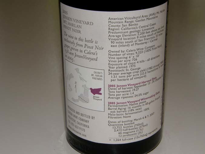 The back label of the Calera wines contains an astonishing amount of information that Pinot Geeks will savor.