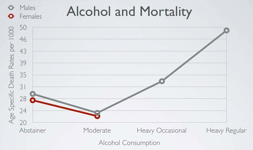 about 1.5 drinks) lowered cardiovascular and all-cause mortality risk and increased life expectancy. The results