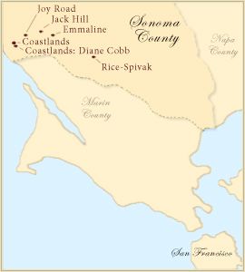 1,300-foot ridge top near Occidental. Planted in sandy loam to four different varieties of Pinot Noir.
