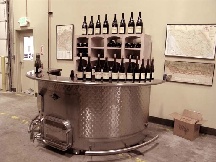 Check out this very cool tasting bar in the Kosta Browne barrel room made of stainless steel fashioned as a cut