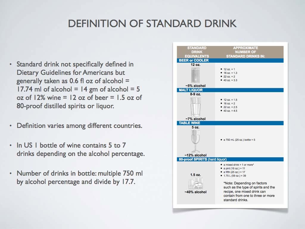 shot of 80-proof distilled spirits. A full bottle of wine contains 5 to 7 standard drinks depending on the wine’s